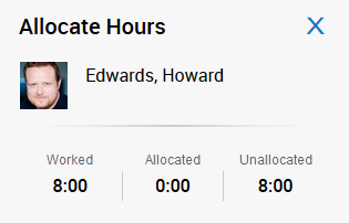 . The Allocate Hours panel opens and provides the employee name, their worked hours, allocated hours, and unallocated hours. The unallocated hours are the available hours that can be allocated. The allocated and unallocated values update automatically as you allocate hours in the panel.